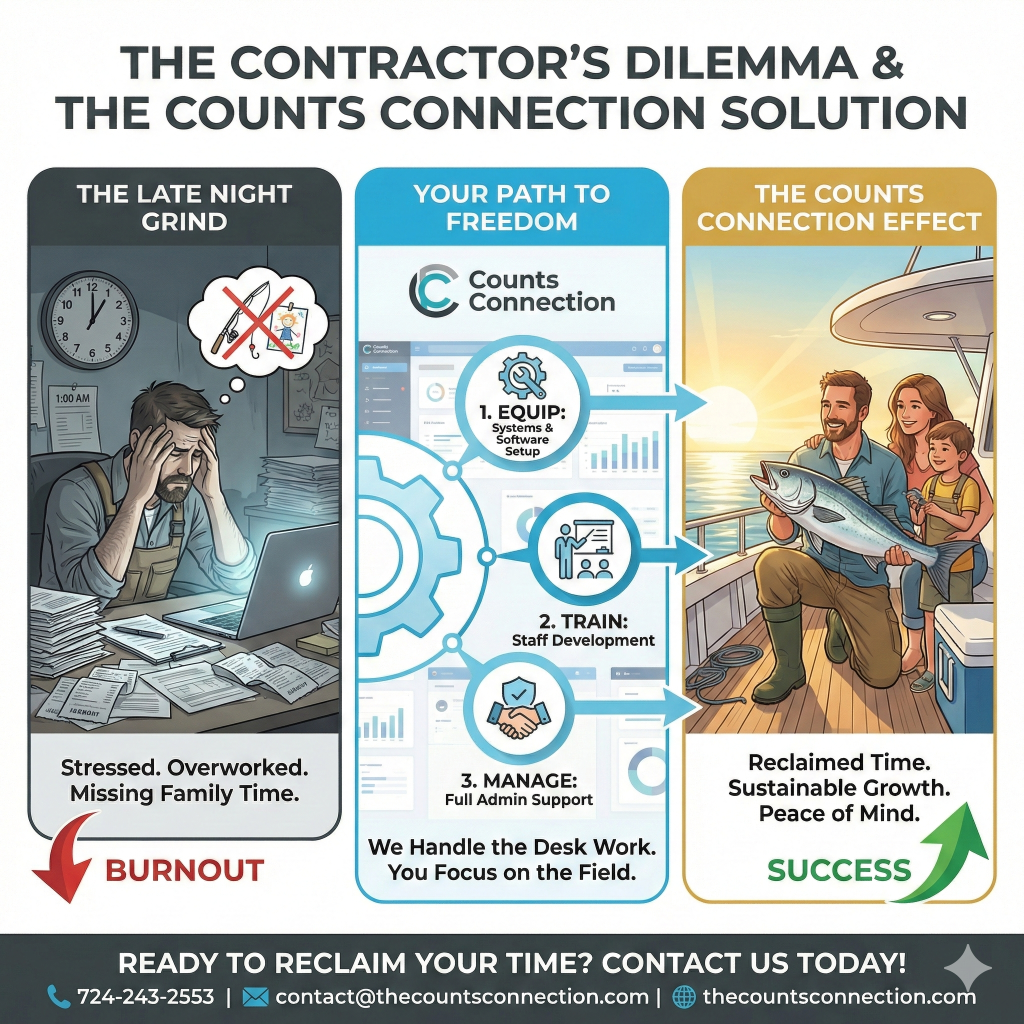 At The Counts Connection, we understand that while you excel at your trade, the administrative side might be a struggle or simply a distraction. We are here to change that dynamic. Whether you need us to equip you for success, train your staff, or take the burden entirely off your plate, we have a solution that fits your unique needs.
