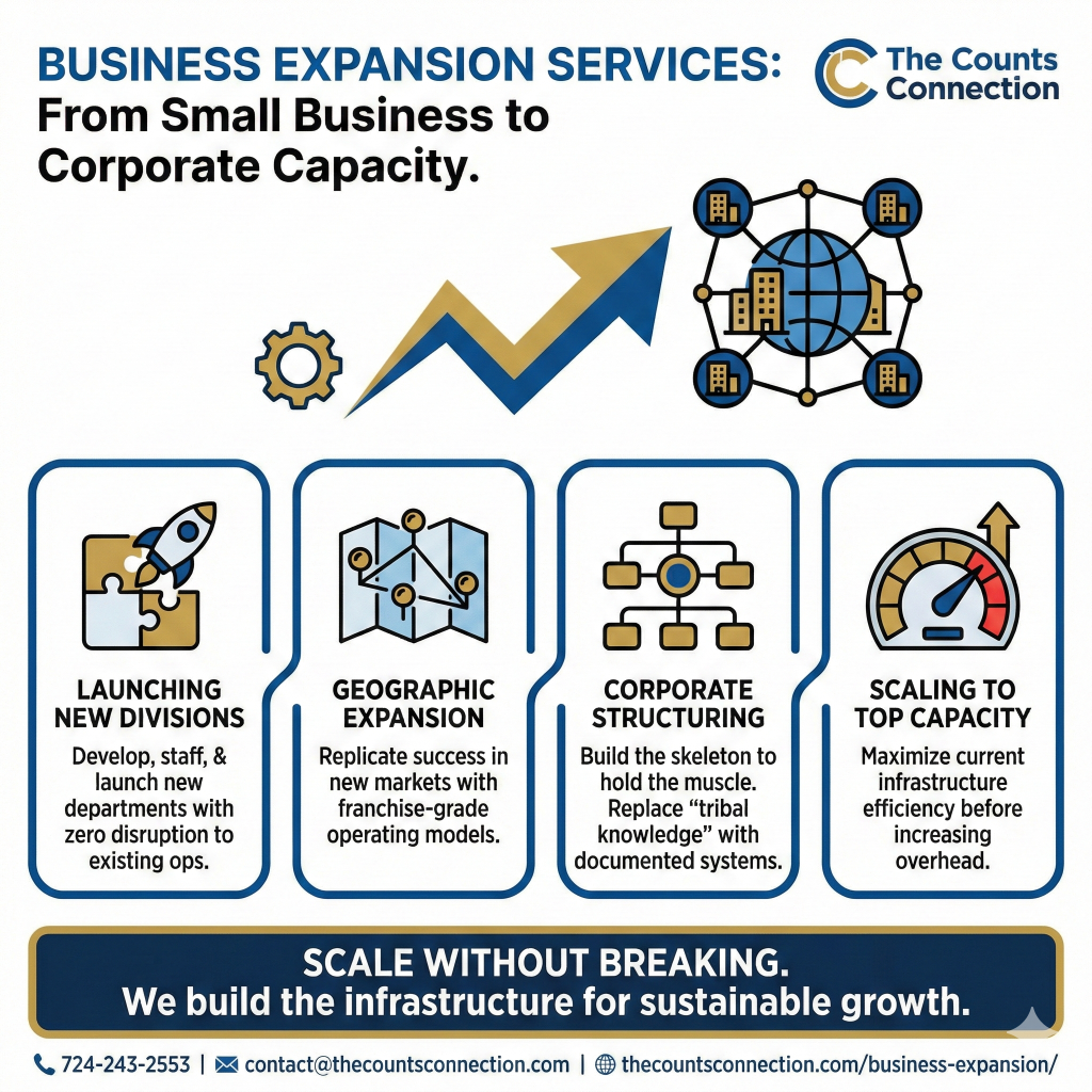 At The Counts Connection, we specialize in helping businesses bridge the dangerous gap between “Small Business” and “Corporate Enterprise.” We build the infrastructure that allows you to scale from your current capacity to your top capacity.