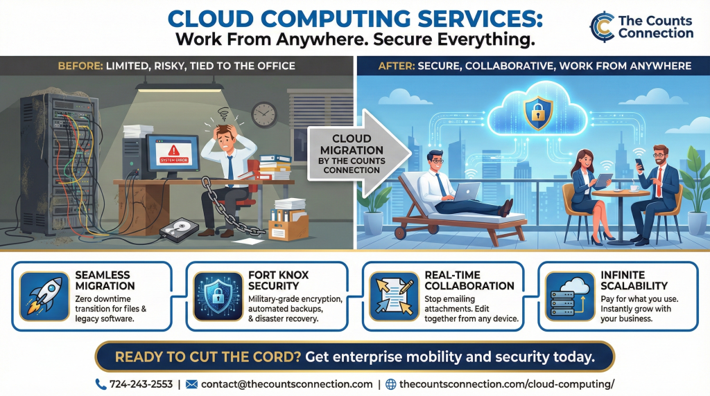 At The Counts Connection, we migrate your business to the cloud. We replace “I have to get back to the office to check that” with “I’ll pull it up on my phone right now.”