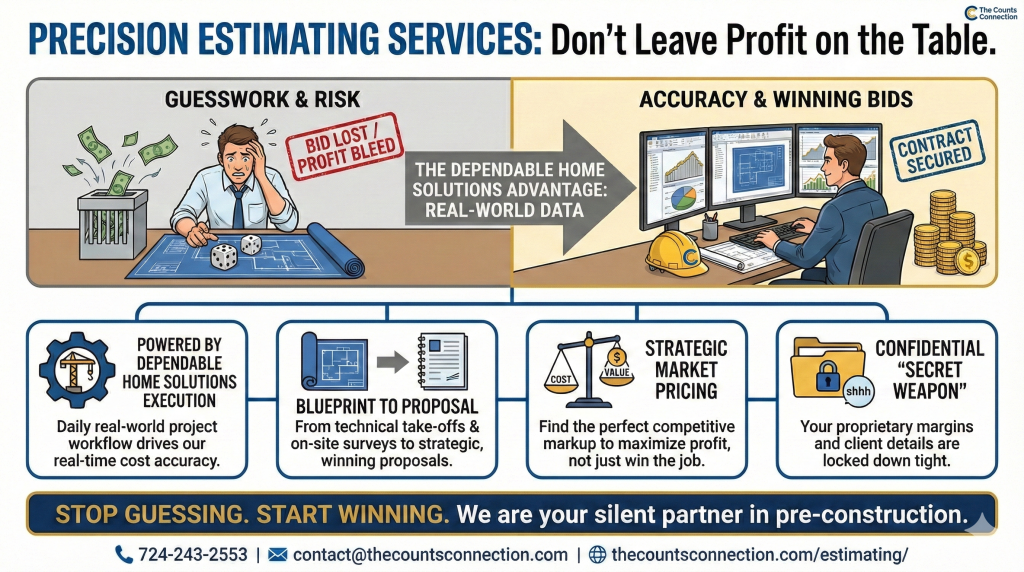 At The Counts Connection, we provide precision estimating services that protect your margins. We don’t just “guess” costs; we scientifically calculate them based on real-time market data and daily operational experience.