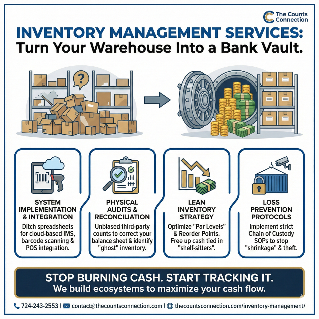 At The Counts Connection, we treat your inventory for what it is: Cash on a shelf. We help you implement the systems, audits, and controls necessary to stop the leaks, prevent theft, and maximize your cash flow.