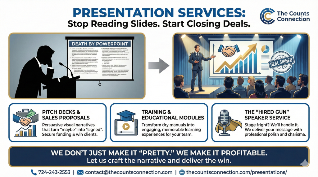 At The Counts Connection, we turn information into influence. We craft the narrative, design the visuals, and—if you want—we will even get on stage and deliver the message for you.